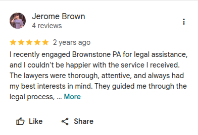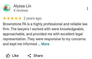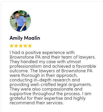 “The lawyers were thorough, attentive, and always had my best interests in mind. I highly recommend Brownstone PA for their exceptional legal services.”